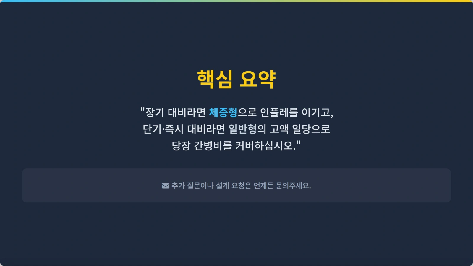 • 주의점: 물가·인건비 상승 시 실질 보장가치 하락. 10~20년 뒤의 간병비를 감안하면 보장 격차가 커질 수 있음.