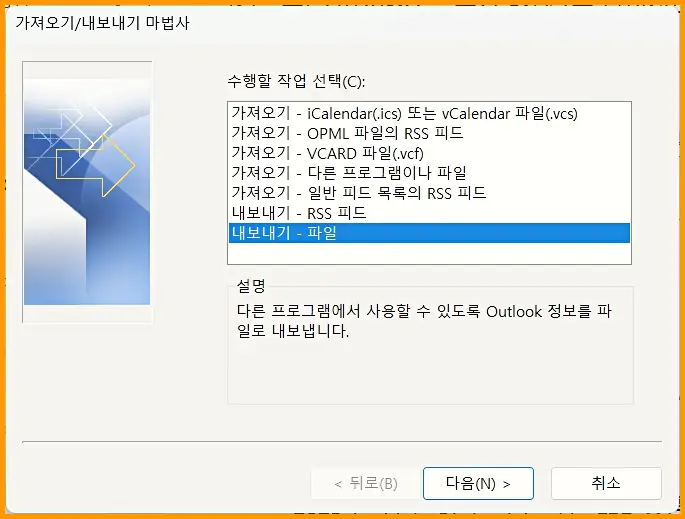 가져오기/ 내보내기 마법사를 선택하면 수행할 작업 선택 부분의 [내보내기-파일] 을 선택합니다.