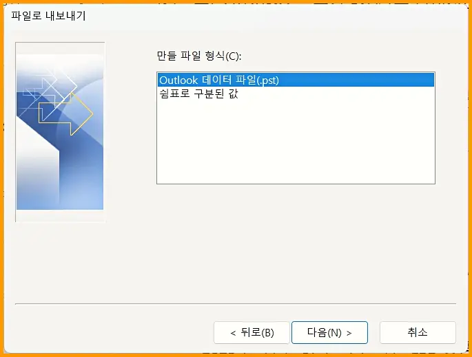 파일로 내보내기가 선택되면 만들 파일 형식 – Outlook 데이터 파일(.pst) 선택합니다.