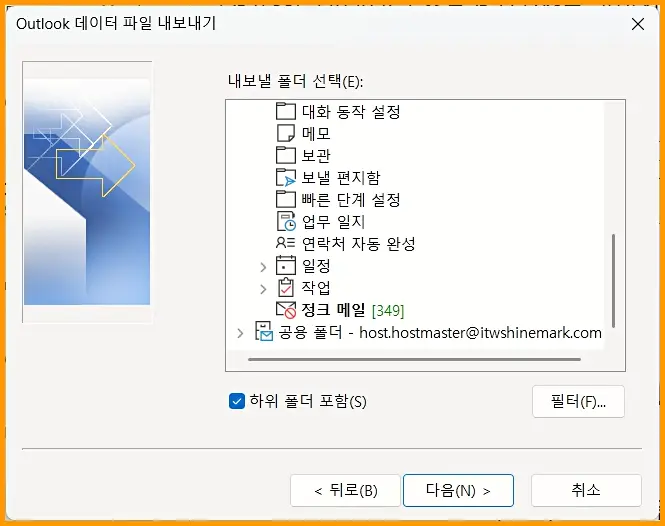 Outlook 데이터 파일 내보내기 선택 후 다음을 선택하면 [내보낼 폴더 선택] 부분에 받은편지, 보낸편지, 지운편지등 여러 폴더들을 선택할 수 있습니다.