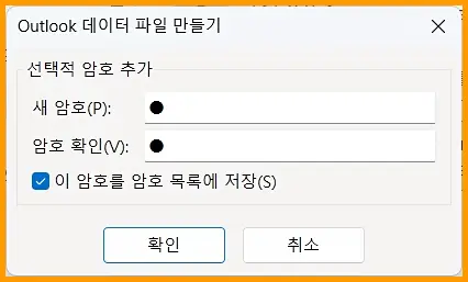 Outlook 데이터 파일 만들기가 시작되면 선택적 암호 추가를 할 수 있습니다. 암호를 입력하고 확인을 누릅니다.
