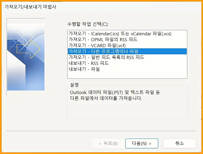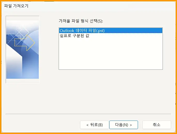 파일 가져오기를 눌러 가져올 파일 형식 선택 – Outlook 데이터 파일(.pst) 를 누릅니다.