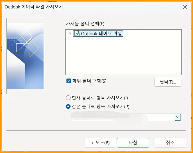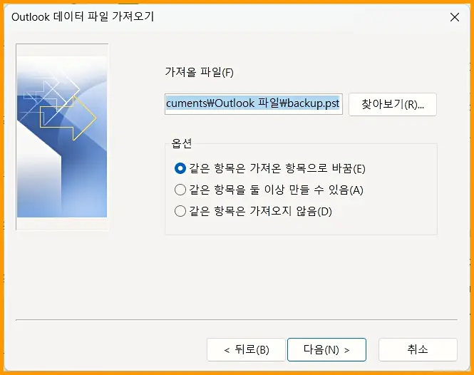 가져올 파일(F) 의 찾아보기를 눌러 아웃룩 백업된 파일의 위치를 선택합니다. 옵션부분도 필요한 부분을 선택합니다.