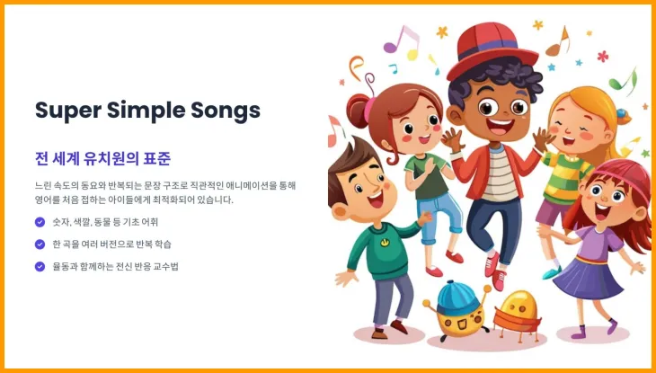 3~6세 첫 노출Super Simple Songs느린 동요, 반복 구조, 손동작까지 함께 익히기 좋음