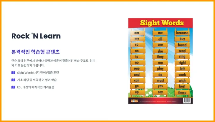 8~12세 ESL 학습Rock ‘N Learn 등 ESL 채널파닉스·리딩·기초 문법까지 체계적으로 다룸​