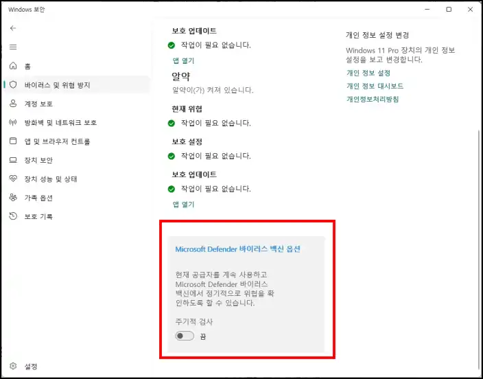 마이크로소프트 디펜더 바이러스 백신옵션을 켬으로 설정합니다.