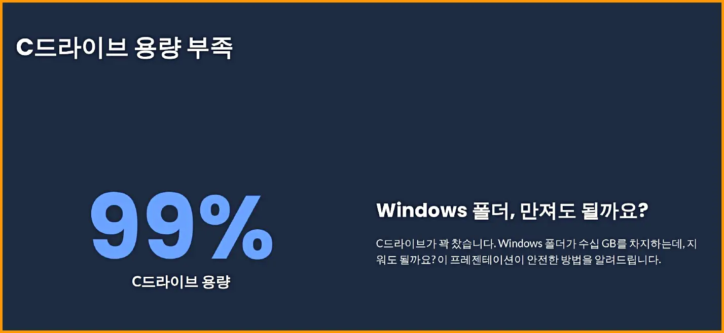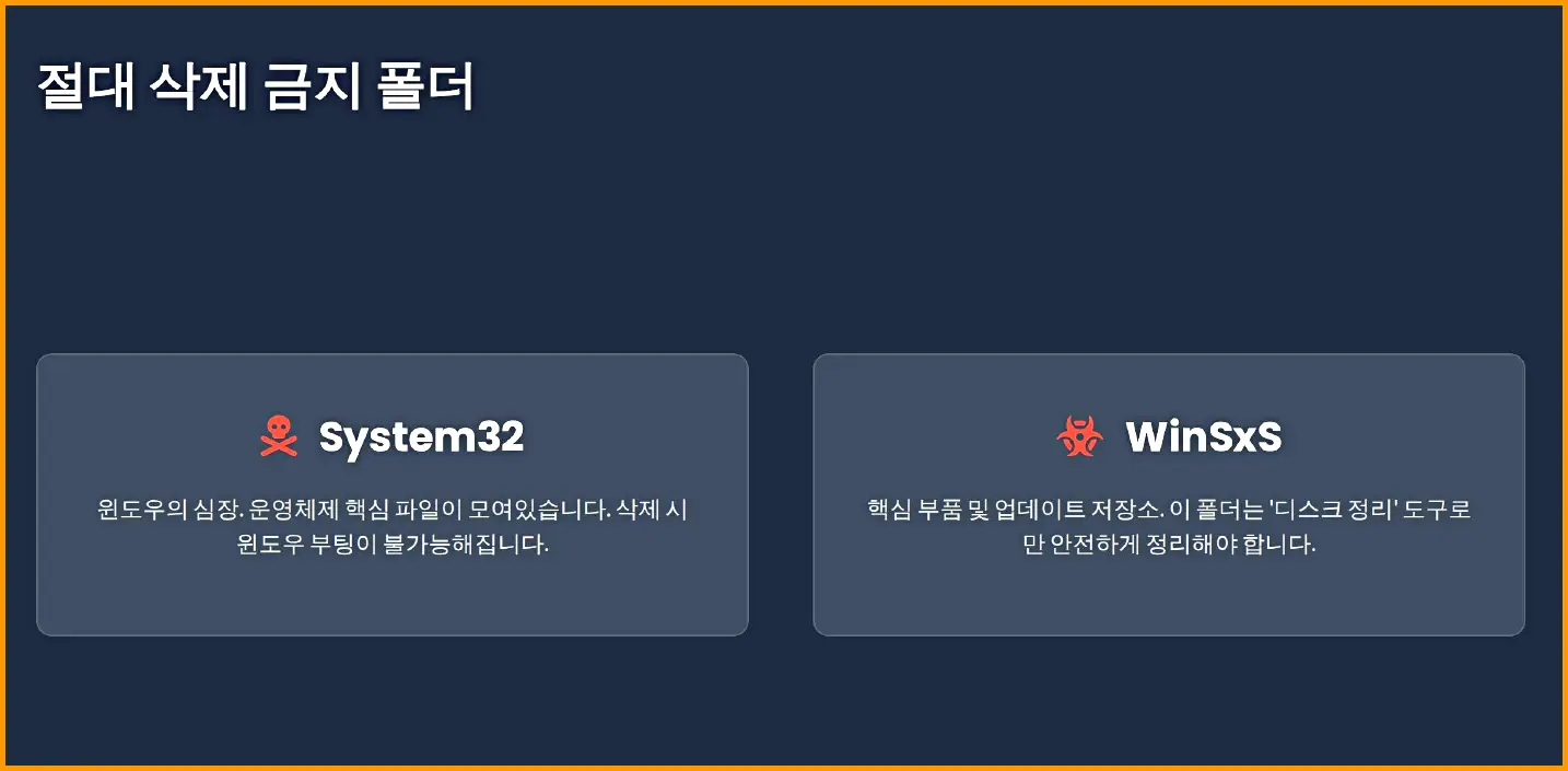 하지만 윈도우 폴더는 운영체제의 핵심이기 때문에 잘못 지우면 부팅이 안 되는 치명적인 오류가 발생할 수 있습니다.