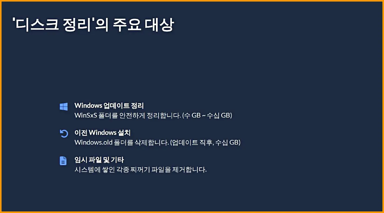 특히 윈도우 업데이트 후 남은 수십 기가바이트의 Windows.old 파일은 이 방법으로만 깔끔하게 지울 수 있습니다.