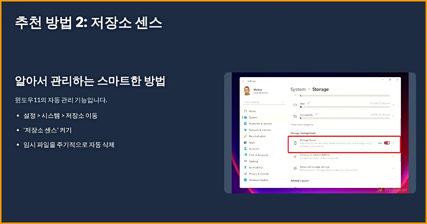 가장 스마트한 방법입니다. 윈도우가 알아서 불필요한 파일을 관리해 줍니다.