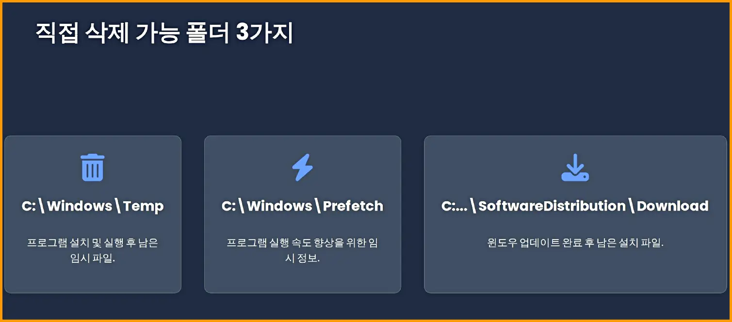 C:\Windows\Prefetch - 참고: 삭제 직후 첫 부팅은 아주 미세하게 느릴 수 있으나 곧 정상화됩니다.