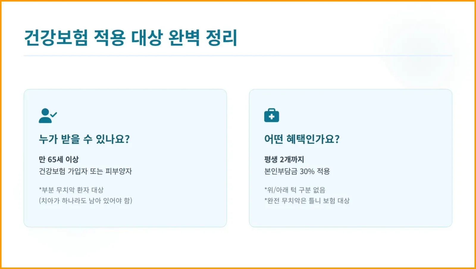 현재 만 65세 이상인 건강보험 가입자 또는 피부양자라면 누구나 혜택을 받을 수 있습니다. 여기서 중요한 것은 ‘평생 2개’라는 개수 제한입니다. 위턱, 아래턱 구분 없이 어금니나 앞니 등 필요한 부위에 식립할 수 있습니다. 단, 치아가 하나도 없는 ‘완전 무치악’ 상태인 경우에는 임플란트 건강보험 적용이 어렵고, 대신 틀니 보험 적용 대상이 된다는 점을 꼭 기억하셔야 합니다. 치아가 적어도 하나는 남아 있어야(부분 무치악) 임플란트 건강보험 혜택을 받을 수 있습니다.
