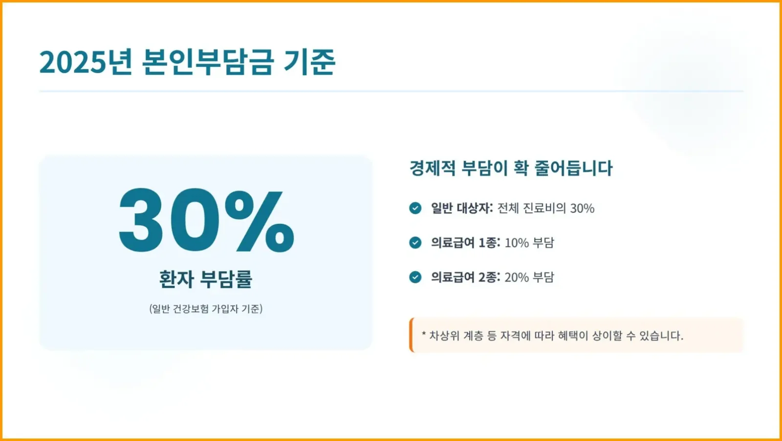 여기서 의료급여 수급자이거나 차상위 계층이신 분들은 혜택이 더 큽니다. 1종 수급자는 10%, 2종 수급자는 20%만 부담하면 되기 때문에 경제적 부담이 획기적으로 줄어듭니다.