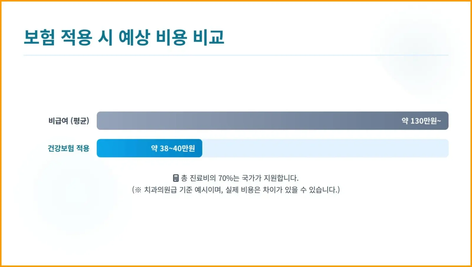 예를 들어볼까요? 만약 건강보험이 적용되는 임플란트 1개당 총 진료비가 약 130만 원으로 책정되어 있다면, 환자분은 이 중에서 약 38만 원에서 40만 원 정도만 내시면 됩니다. 나머지 70%인 90여 만 원은 건강보험공단에서 치과에 지급하는 구조입니다.