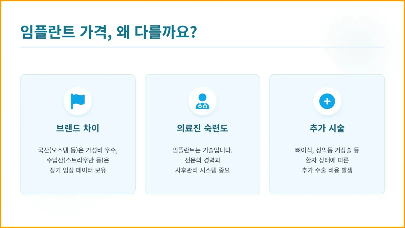 국산 브랜드(오스템, 덴티움, 네오, 디오 등)는 세계적인 수준으로 성장했으며, 가격 경쟁력이 뛰어납니다. 보통 비급여 기준으로 80만 원에서 120만 원 선에 형성되어 있습니다. 데이터가 많이 축적되어 있어 안전성도 입증되었습니다.