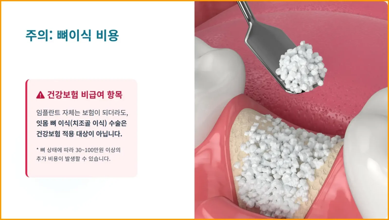 “임플란트 38만 원에 해드립니다”라는 광고만 보고 갔다가, 뼈이식 비용으로 100만 원을 더 내야 하는 상황이 생길 수 있다는 점을 꼭 명심하세요.