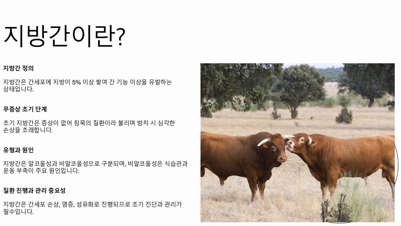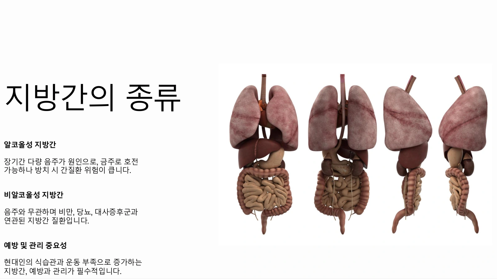 지방간→지방간염→간경변→간암이라는 단계적 악화 과정에서 빠른 진단과 적극적인 치료가 매우 중요합니다.