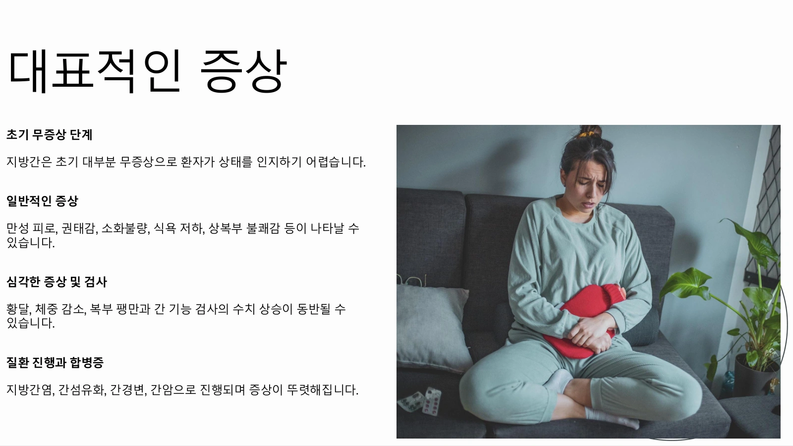 대부분의 환자가 지방간 초기에는 특별한 증상이 없어 자신의 건강에 이상을 느끼지 못합니다.