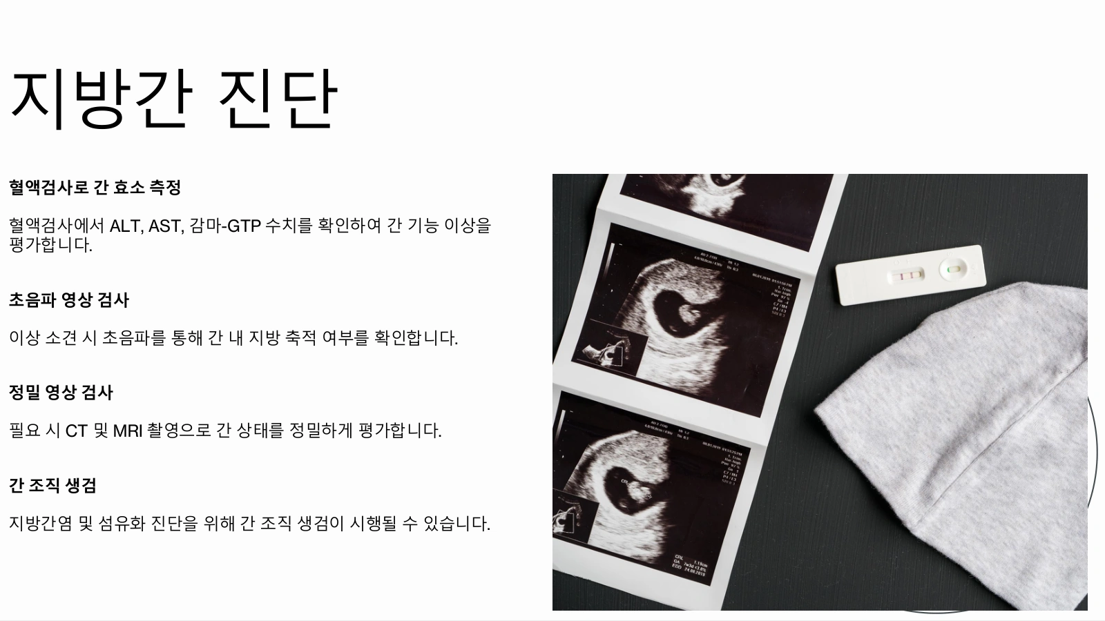 가장 먼저 혈액검사에서 간 효소 수치(ALT, AST, 감마-GTP 등)를 확인하게 되며, 이상 수치가 나올 경우 초음파(간 내 지방 축적 확인), 필요 시 간 조직 생검으로 진단이 확정됩니다.