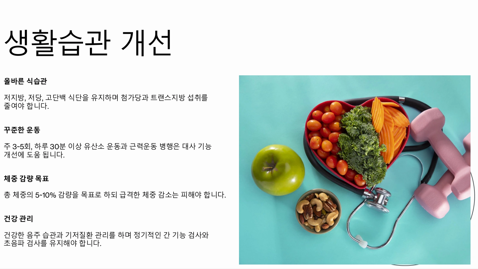 - 간기능 혈액검사, 간 초음파 등 주기적 건강검진 필요
