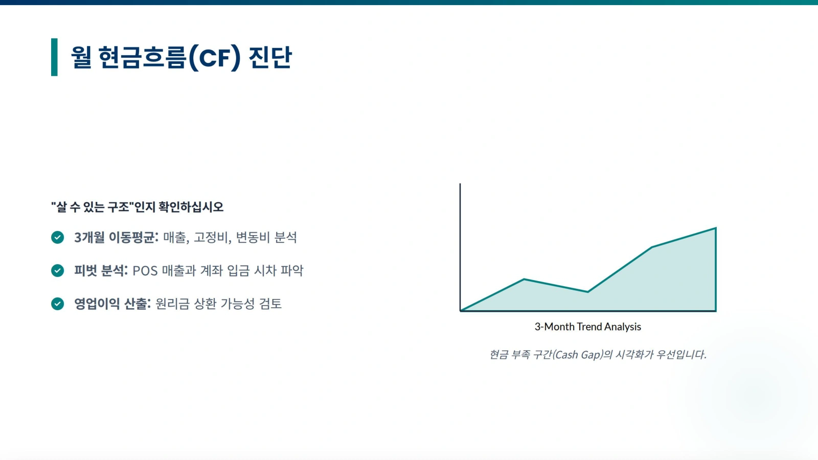 저는 POS 매출과 계좌 입금 내역을 주·월 단위로 피벗해 보면서 카드 결제일 전후 현금 부족 구간을 파악했습니다. 이걸 하면 ‘언제 꼭 돈이 말라버리는지’가 명확해집니다.
