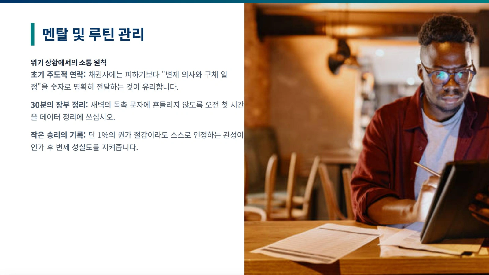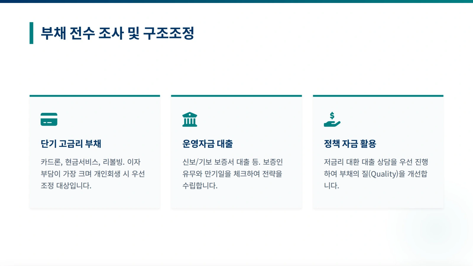 실전 팁: 저금리 정책자금(지역신용보증재단 연계) 상담을 먼저 받고, 고금리·단기성 부채를 구조조정하는 순서를 생각하세요.