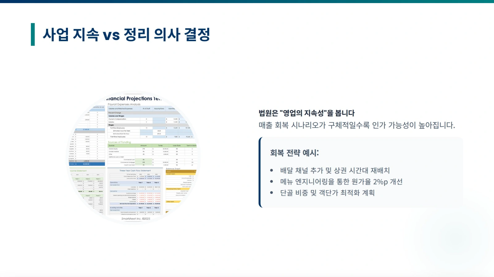 - 관건: 생활·영업의 지속 가능성, 성실 변제, 투명한 정보.