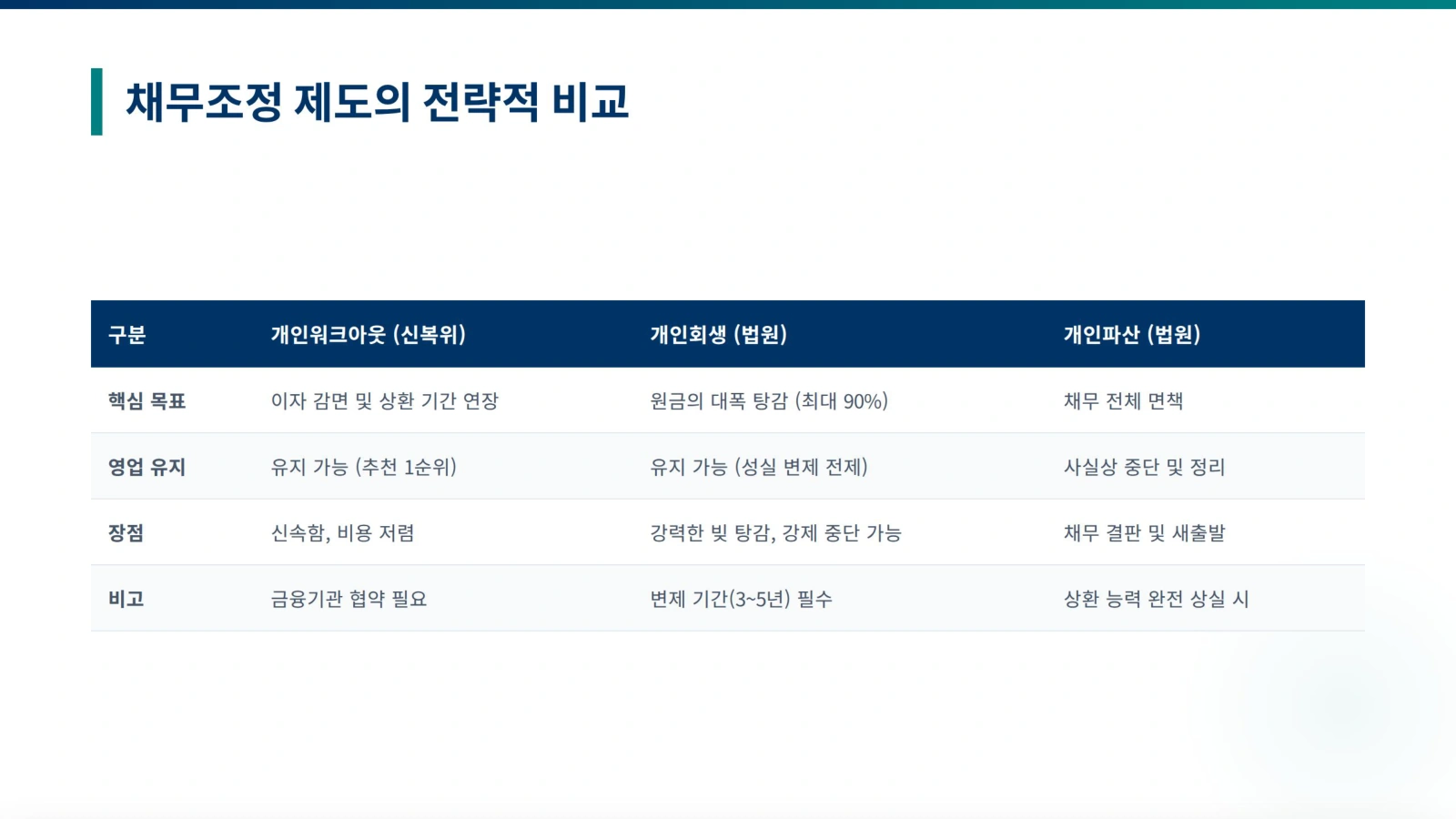 - 개인회생: 수입 대비 합리적 변제 후 남은 채무 탕감 가능. 다만 서류·기간·성실 변제가 핵심.