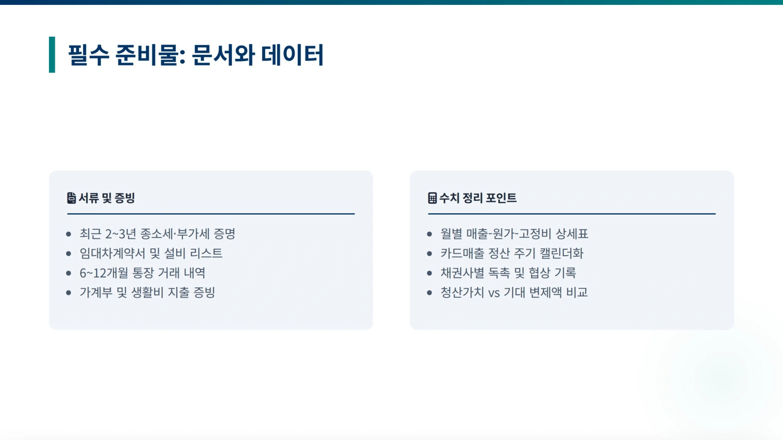 - 사업자 재산(설비, 재고, 임차보증금), 개인 재산(예금, 차량, 부동산, 전세보증금)을 누락 없이 준비하세요.
