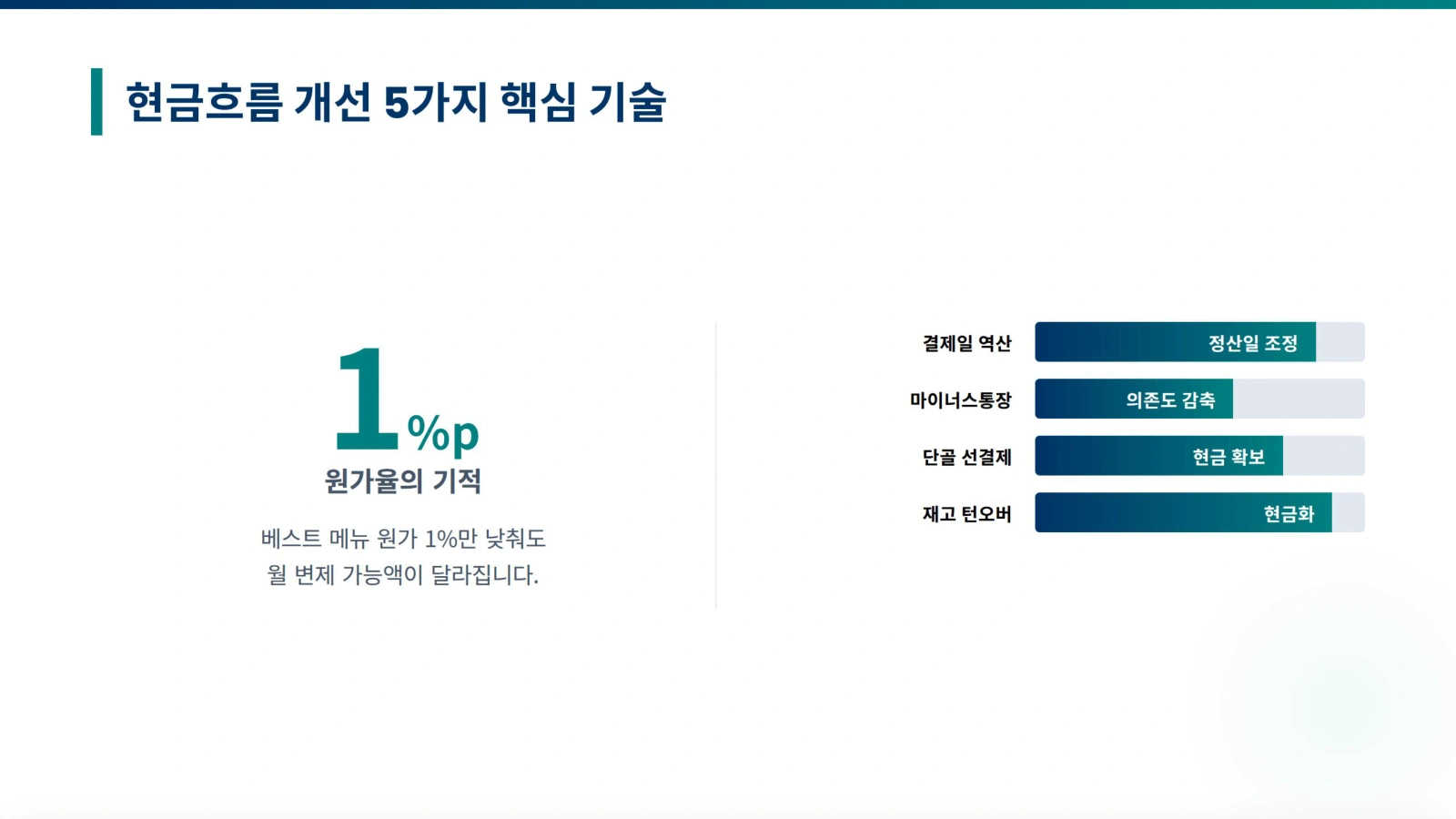 - 대금 회수 계획: 외상·정산 지연 채널 개선, 현금 결제 유도