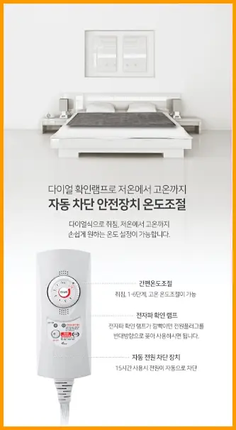 • 다이얼식 안전장치: 저온부터 고온까지(1~6단계 및 취침 모드) 원하는 온도를 세밀하게 조절할 수 있으며, 과열 시 자동으로 전원을 차단하는 안전장치가 내장되어 있습니다.
