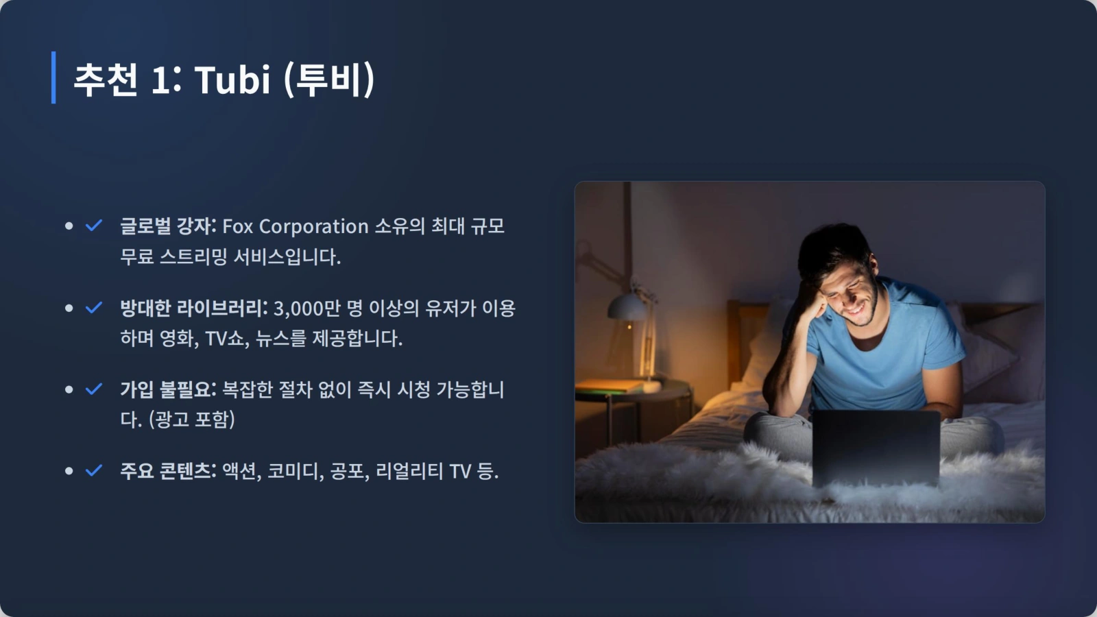 - 합법적 서비스 이용: 위에서 추천한 Tubi, Popcornflix 등은 **광고 기반 무료 서비스(AVOD)**입니다. 광고를 시청하는 것이 바로 서비스의 유지 동력입니다.