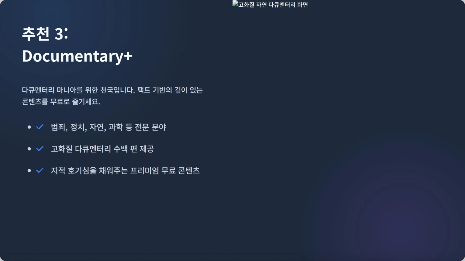 - 특징: 실제 범죄, 정치, 스포츠, 자연, 기술 등 다양한 주제에 걸친 수백 편의 무료 다큐멘터리를 제공합니다. 복잡한 다큐멘터리 장르를 무료로 심도 깊게 시청할 수 있다는 것이 큰 장점입니다.