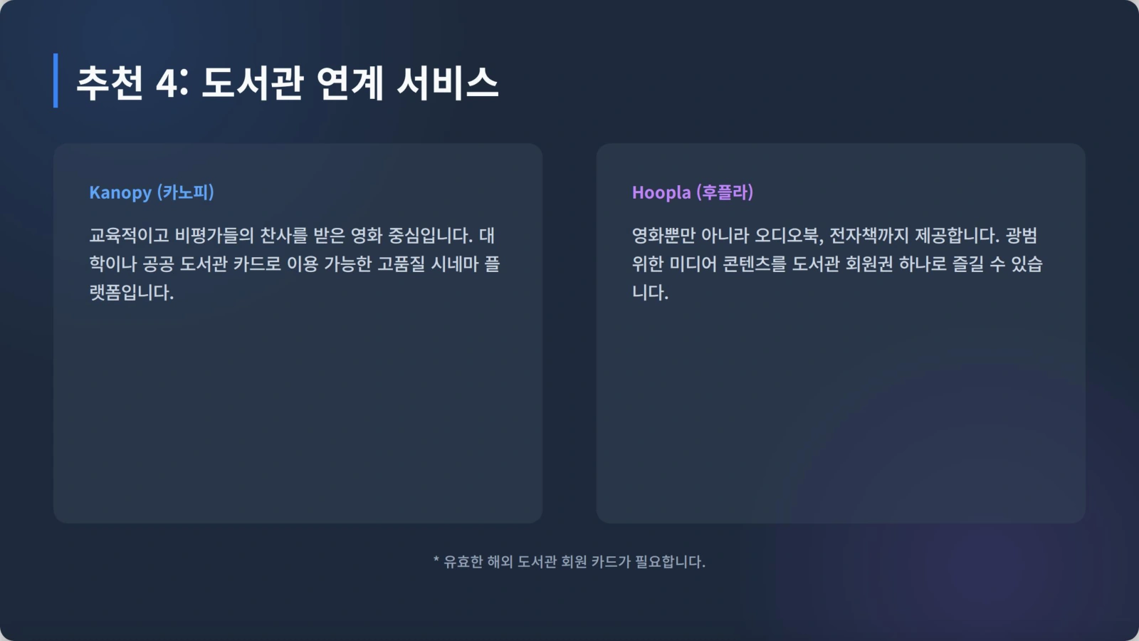 - 특징: 콘텐츠의 질이 매우 높으며, 특히 Kanopy는 교육적이거나 비평가들의 극찬을 받은 영화와 다큐멘터리 중심으로 구성되어 있습니다.