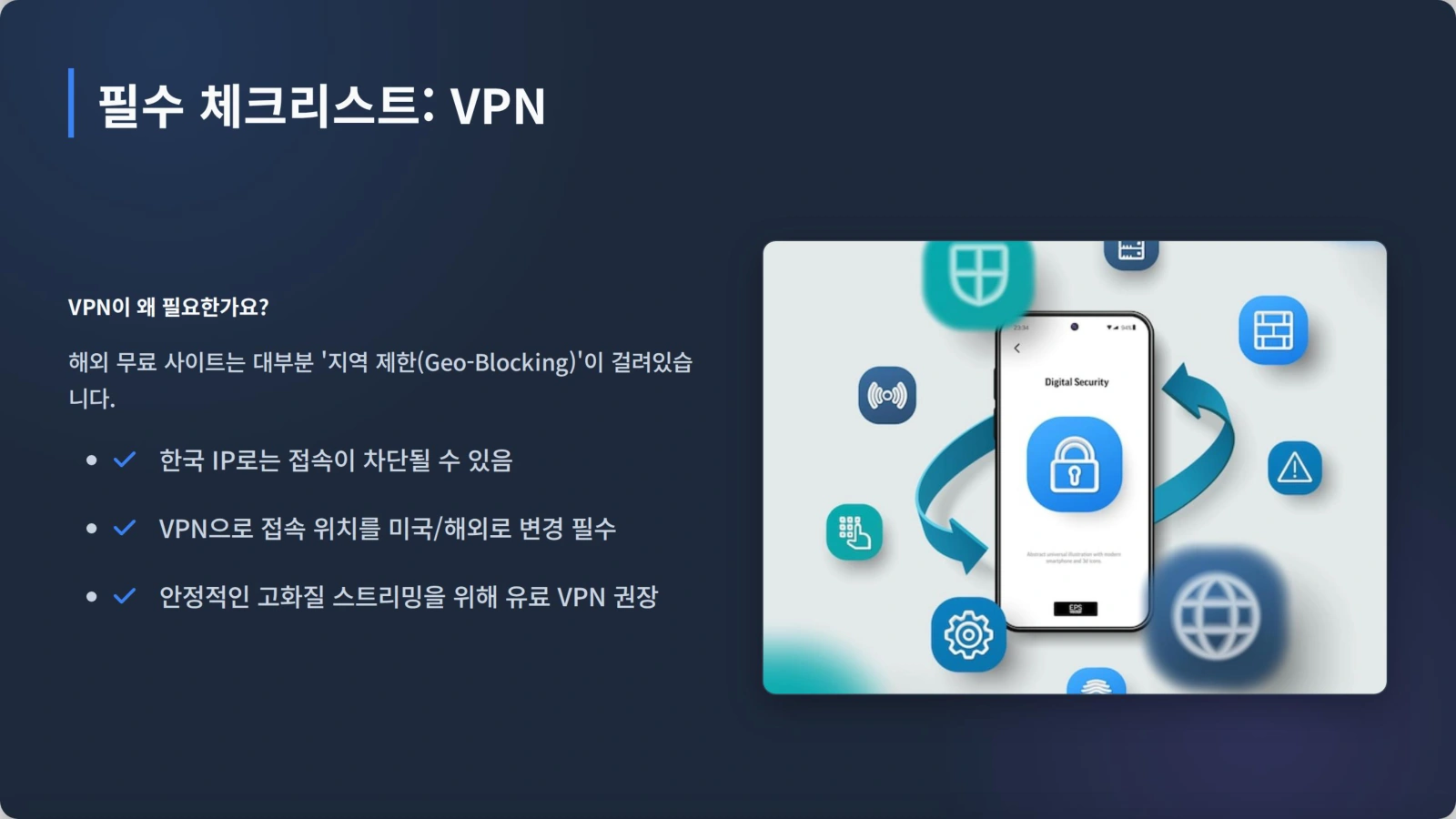 - VPN 필수? 많은 해외 스트리밍 사이트가 ‘지역 제한(Geo-Blocking)’을 걸어두어, 한국에서는 VPN 없이는 아예 접속조차 불가능한 경우가 많습니다. VPN 설치와 설정, 그리고 유료 VPN 구독료는 또 다른 부담이죠.
