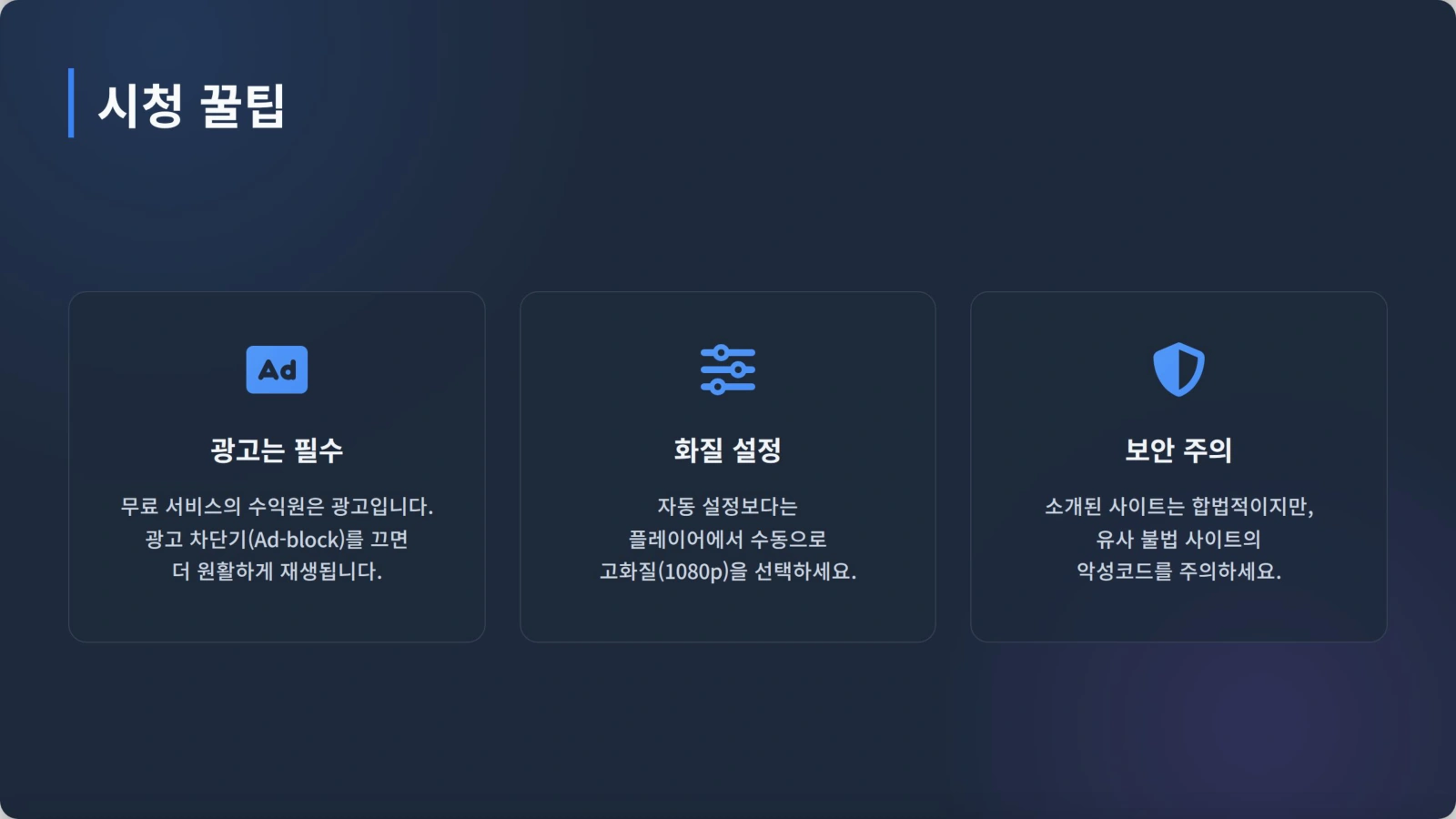 - 가독성(UI/UX): 대부분의 무료 스트리밍 사이트는 네트워크 환경에 따라 화질을 자동으로 조절합니다. 고화질 시청을 원한다면, 접속 후 플레이어 설정에서 수동으로 화질을 높여주는 것이 좋습니다. (단, 인터넷 속도가 느릴 경우 로딩이 길어질 수 있습니다.)