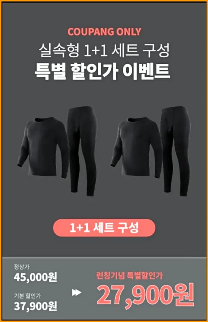 게다가 지금 쿠팡에서 상의 + 하의 세트 2벌 (1+1 세트 구성)을 파격적인 특별 할인가에 만나볼 수 있습니다. (정상가 대비 무려 46% 할인된 가격!)