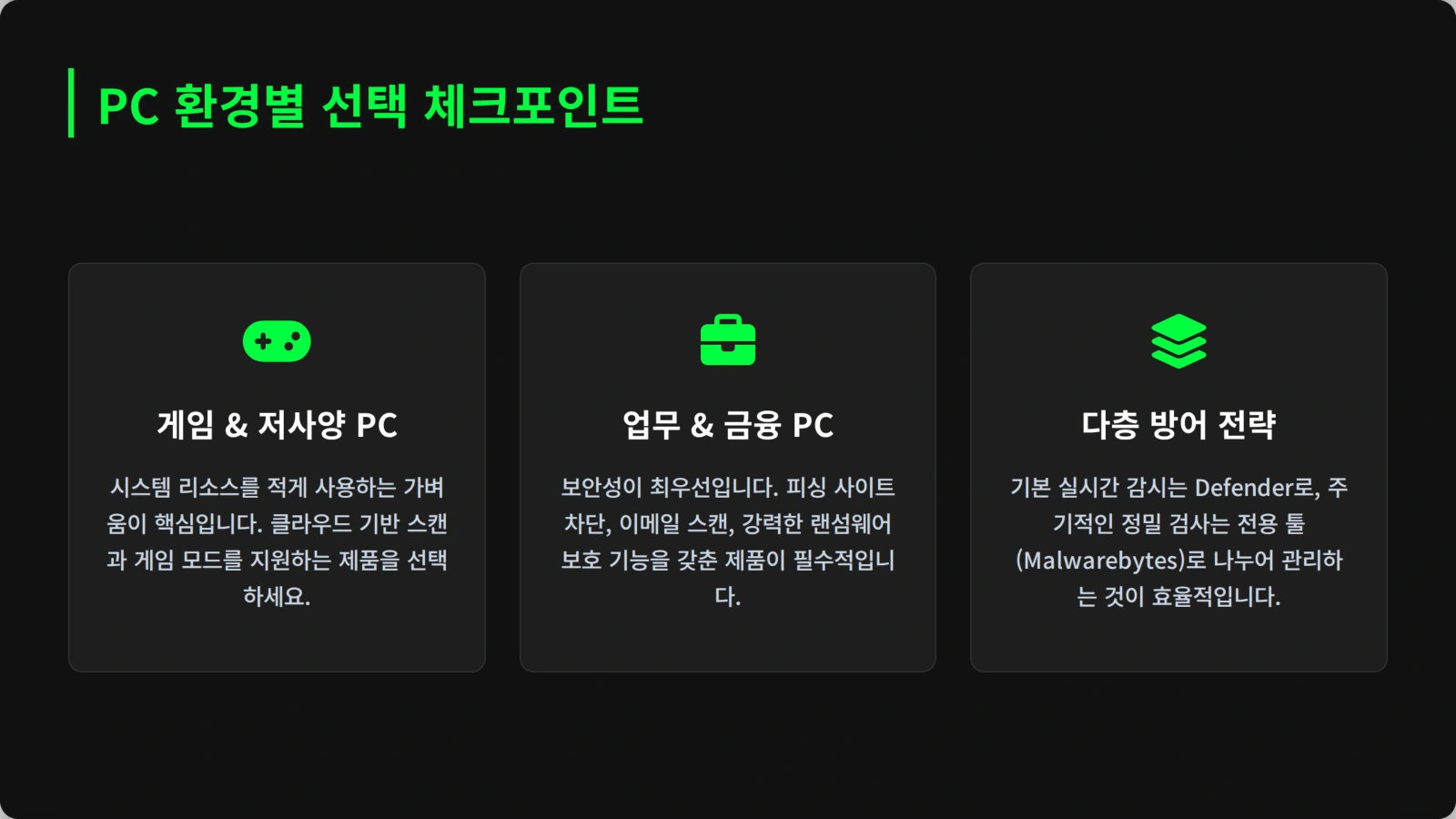 - 가벼움·게임 지연 최소화가 중요하다면 클라우드 기반 스캔, 게임 모드를 지원하는 제품이 유리하다.
