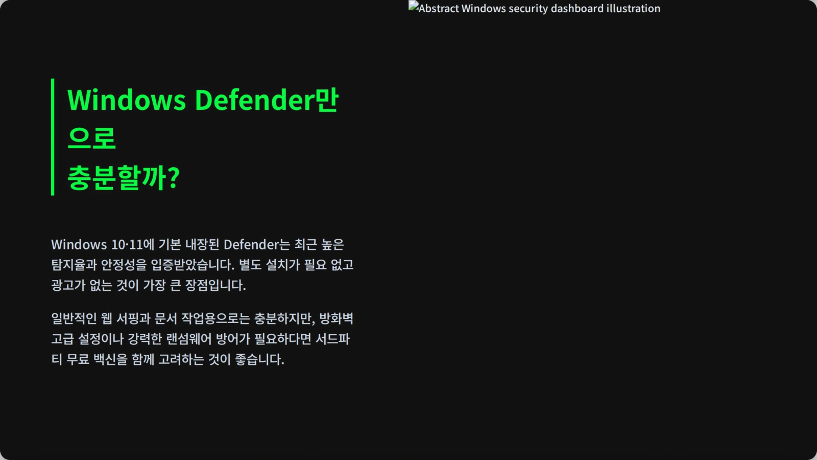 다만 방화벽 고급 설정, 비밀번호 관리, 보안 VPN, 광범위한 랜섬웨어 방어까지 원한다면 서드파티 무료 백신이나 유료 제품을 함께 고려하는 편이 좋다. 일반적인 웹 서핑·문서 작업 위주의 사용자는 Defender만으로도 충분하지만, 다운로드가 잦거나 외부 저장장치를 자주 연결한다면 추가 무료 백신으로 보조 보호층을 만들어 두는 방법이 현실적이다.