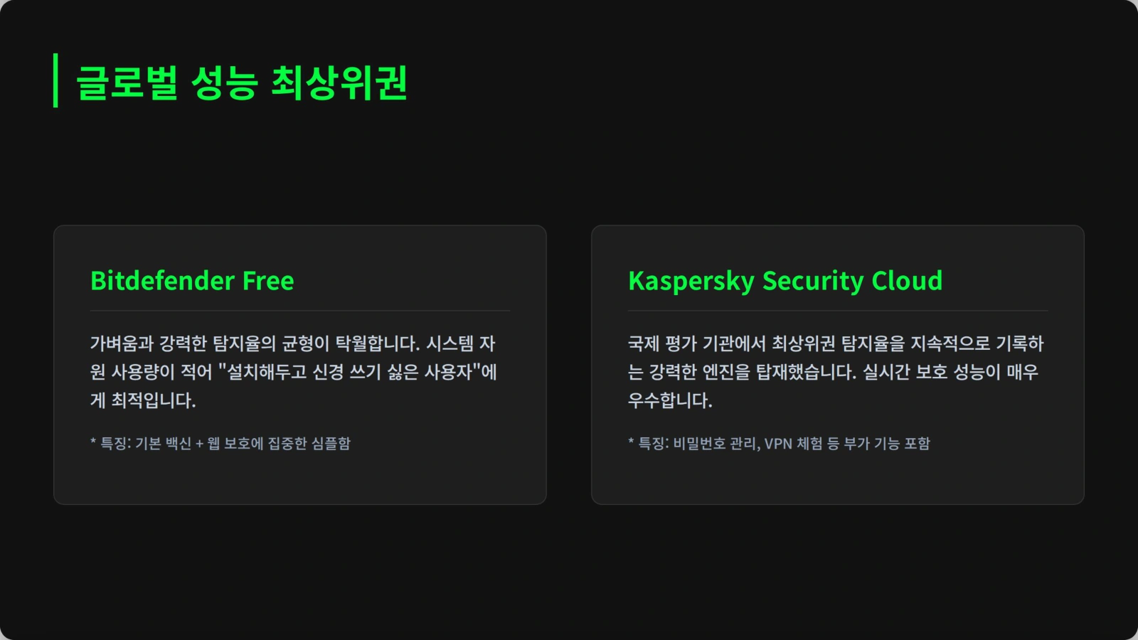 | Kaspersky Free | 국제 평가 최상위권의 강력한 탐지 엔진. | 중간 | 보안 성능 최우선 사용자 |