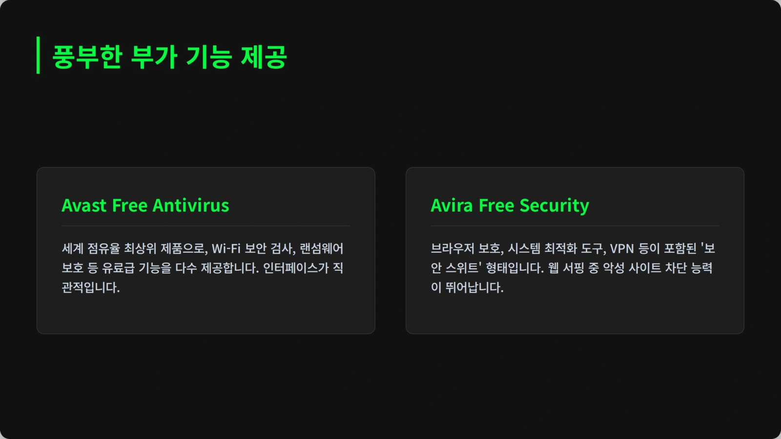 | Avast Free | 랜섬웨어·Wi‑Fi 검사 등 부가 기능 풍부. | 중간~무거움 | 기능 많은 올인원 무료 백신이 필요한 사용자 |
