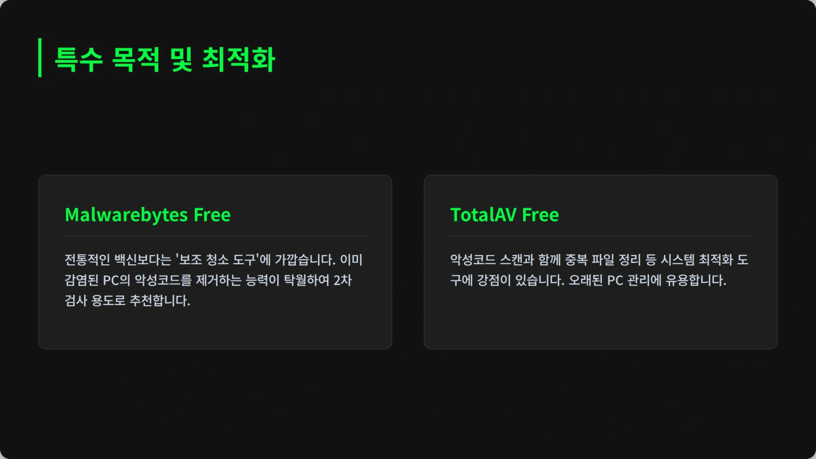| TotalAV Free | 시스템 정리·최적화 도구 강점. | 중간 | 오래된 PC·용량 부족 PC 관리용 |