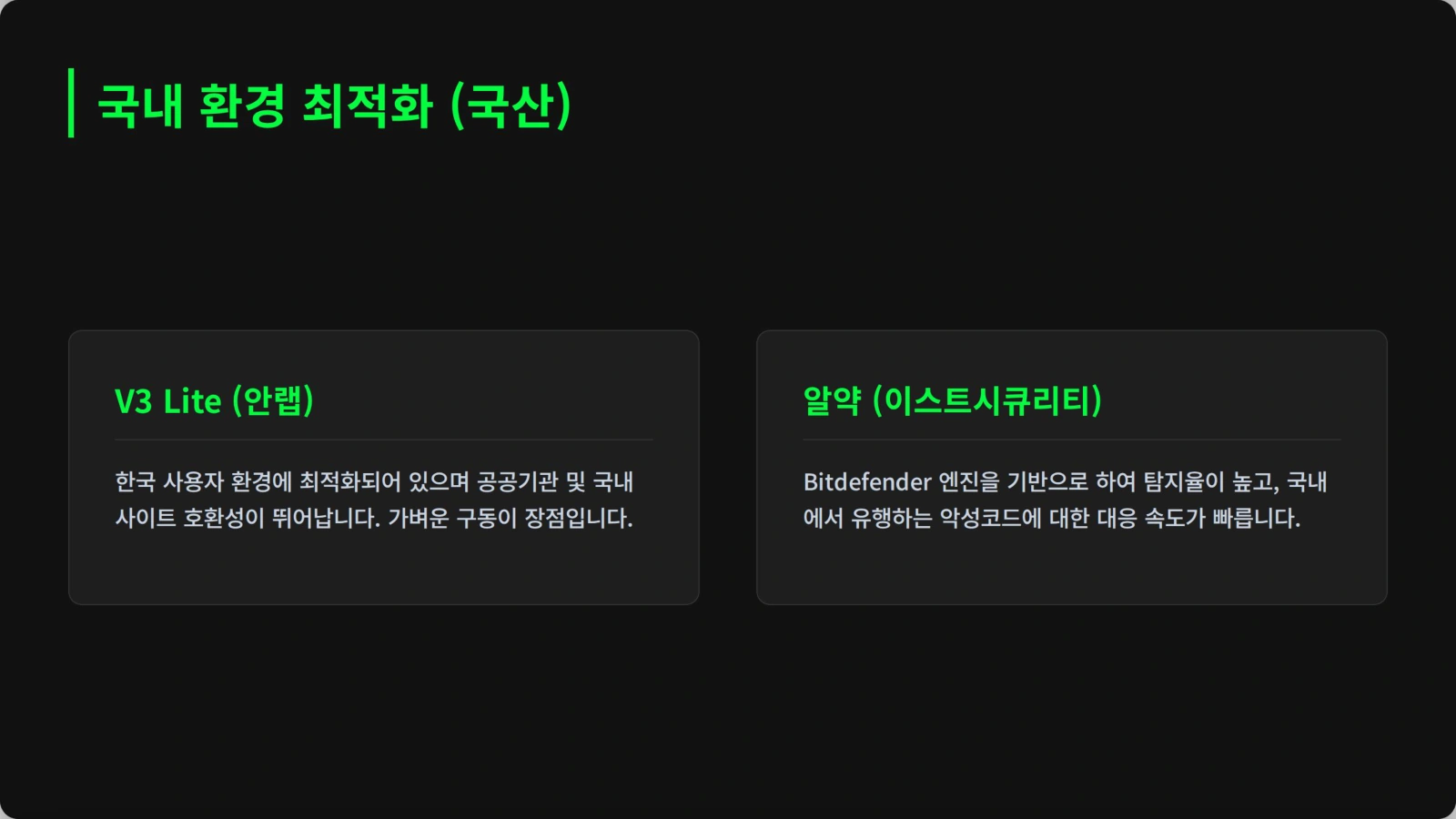 | 알약(무료) | 국내 악성코드 데이터베이스가 풍부한 편. | 무거움 | 국산 백신 선호, 성능 좋은 PC 사용자 |