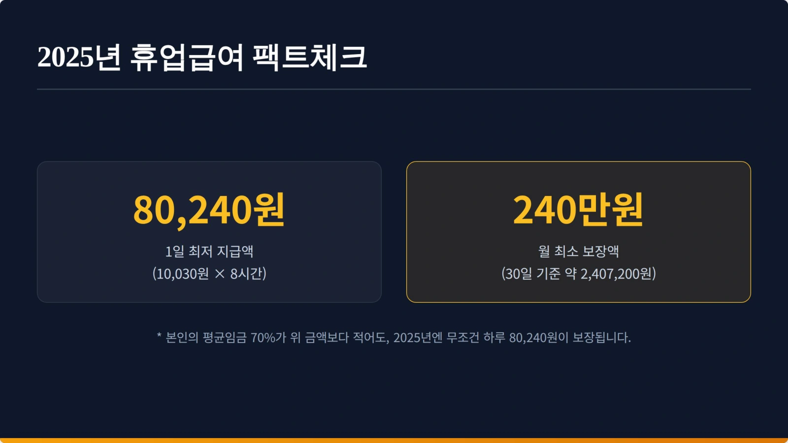 만약 본인의 평균임금의 70%가 80,240원보다 적다면, 2025년에는 무조건 하루 80,240원을 기준으로 휴업급여가 지급됩니다. 한 달(30일 기준)로 치면 최소 2,407,200원의 휴업급여가 보장되는 셈입니다. 이는 아르바이트나 일용직 근로자분들에게 매우 중요한 안전장치입니다.