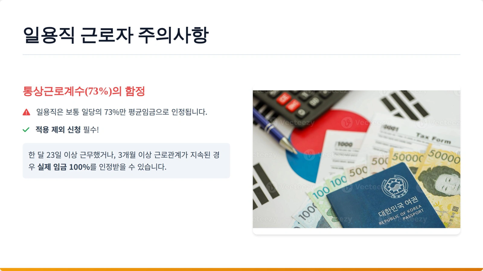 일용직 근로자는 ‘일당 × 73%’를 평균임금으로 보는 통상근로계수가 적용되어 실제 소득보다 낮게 책정될 위험이 있습니다. 만약 본인이 한 달에 23일 이상 꾸준히 근무했거나 근로관계가 3개월 이상 지속되었다면, ‘적용 제외 신청‘을 통해 실제 받은 임금 100%를 평균임금으로 인정받아야 합니다. 이 부분을 놓쳐서 보상금을 적게 받는 경우가 2025년에도 여전히 많을 것으로 예상됩니다.
