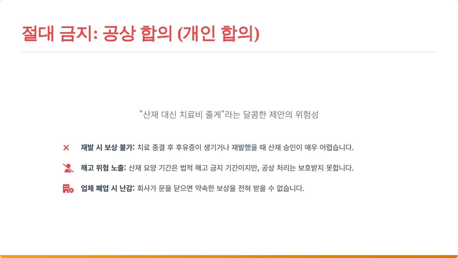 회사가 “산재 처리하면 보험료 올라가니까 치료비랑 위로금 줄게”라며 개인 합의(공상 처리)를 제안하는 경우가 있습니다. 2025년에도 이는 여전히 위험한 선택입니다.