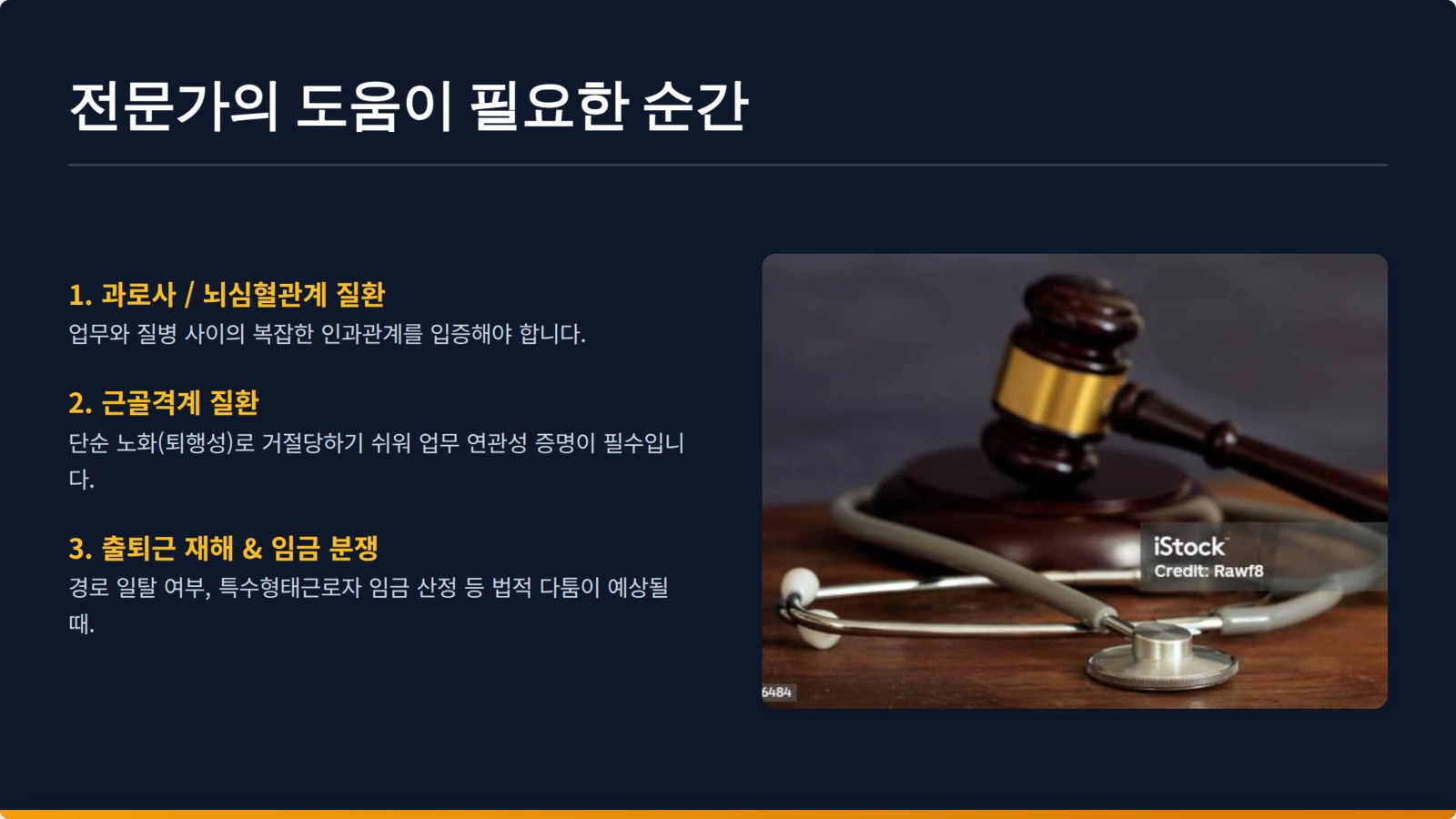 단순 골절이나 명확한 사고는 혼자서도 신청 가능합니다. 하지만 다음과 같은 경우는 반드시 노무사 등 전문가의 상담을 받아보시는 것이 좋습니다.