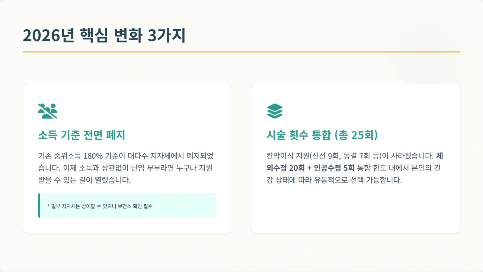 - 변경된 점: 체외수정(신선+동결) 20회 + 인공수정 5회 = 총 25회라는 큰 틀 안에서, 의학적 판단에 따라 시술 종류를 유연하게 선택할 수 있습니다. 난임 부부마다 필요한 시술 종류가 다르다는 점을 반영한 합리적인 변화입니다.