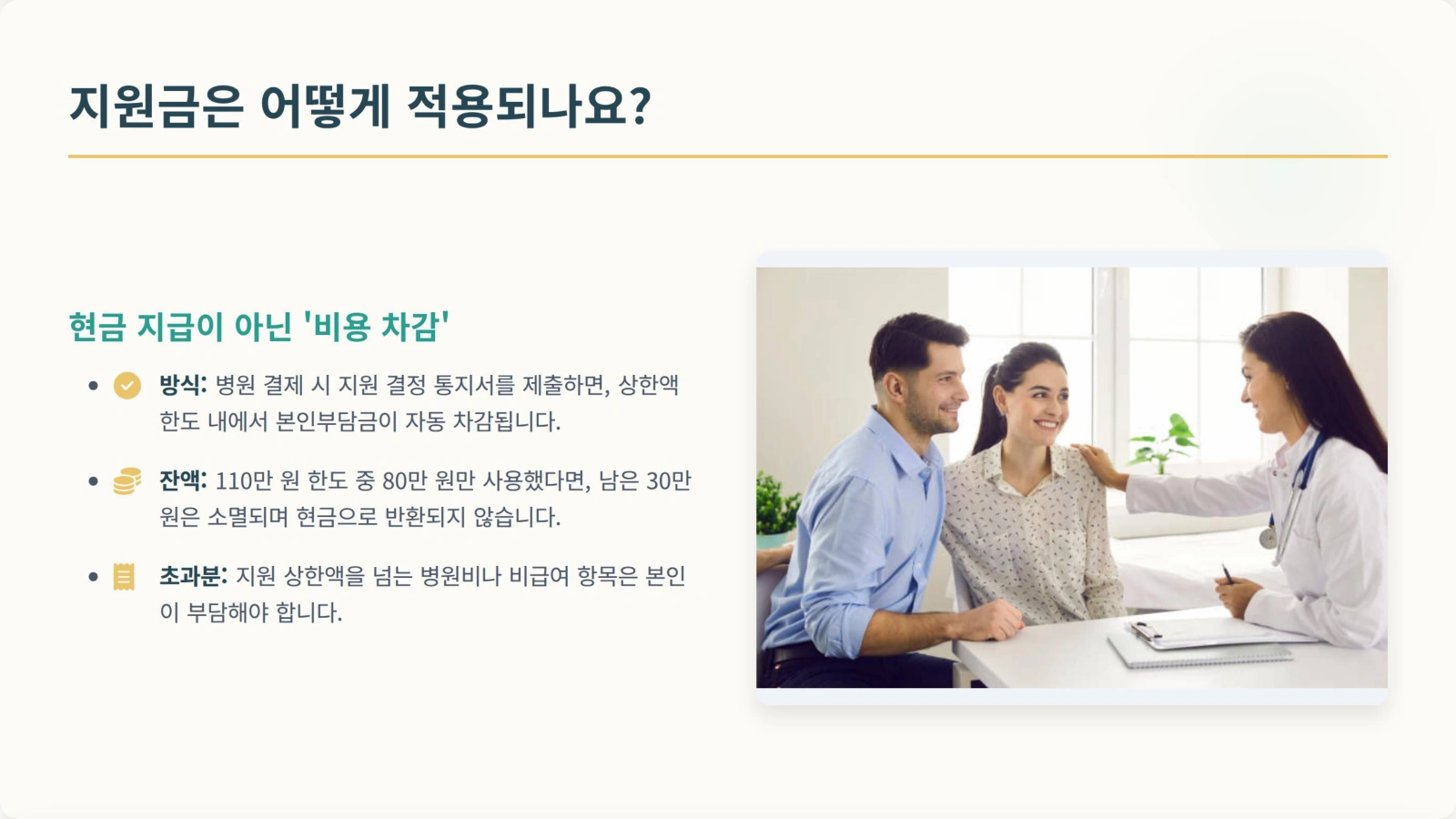 많은 분들이 오해하시는 부분입니다. 110만 원을 현금으로 입금해 주는 것이 아니라, ‘발생한 병원비 중 본인부담금’을 상한액 내에서 차감해 주는 방식입니다.