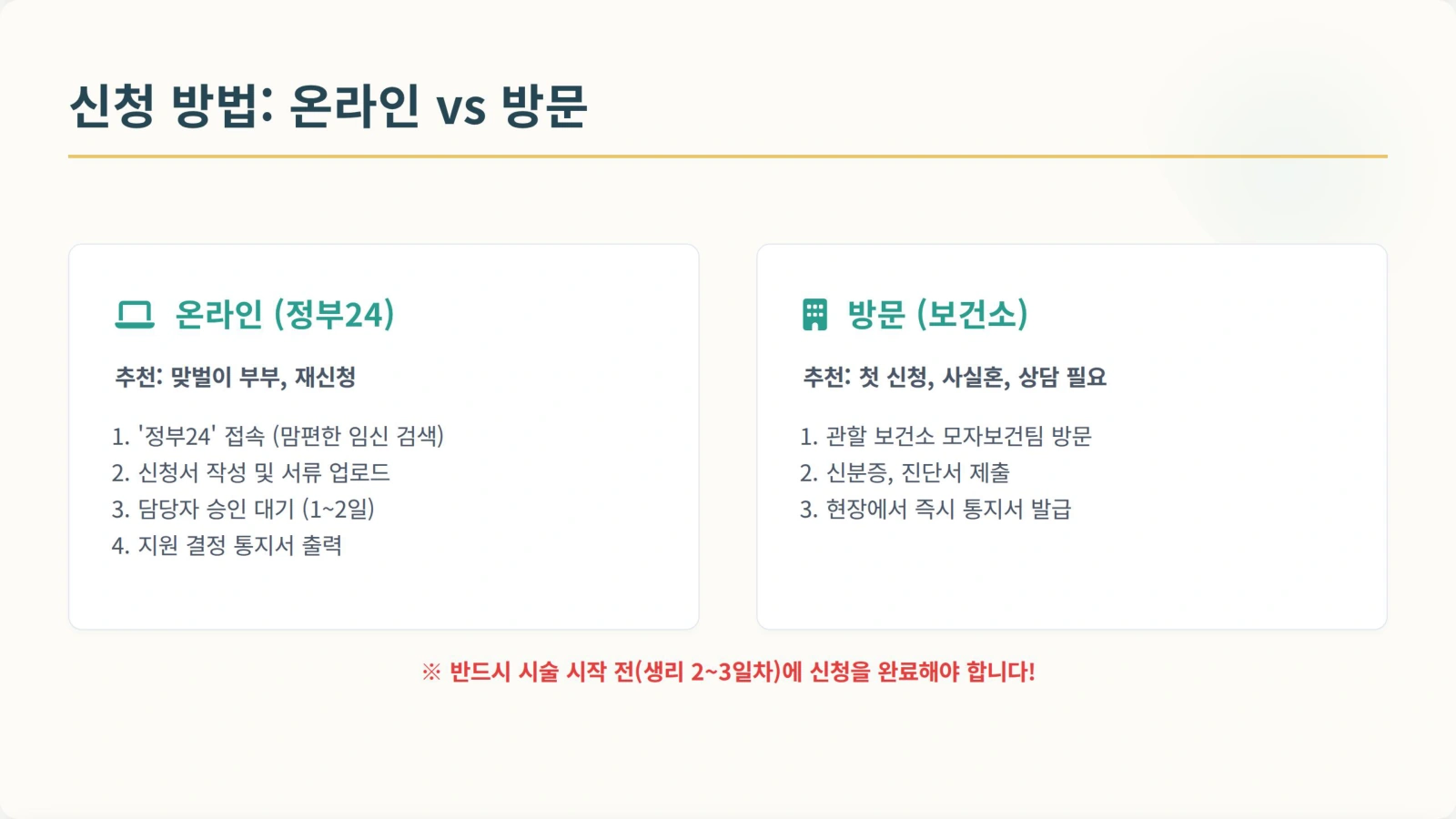 신청은 **반드시 시술 시작 전(생리 시작 2~3일 차 병원 방문 전)**에 완료되어야 합니다. 시술이 시작된 후 신청하면 그 이전 비용은 소급 적용되지 않습니다.