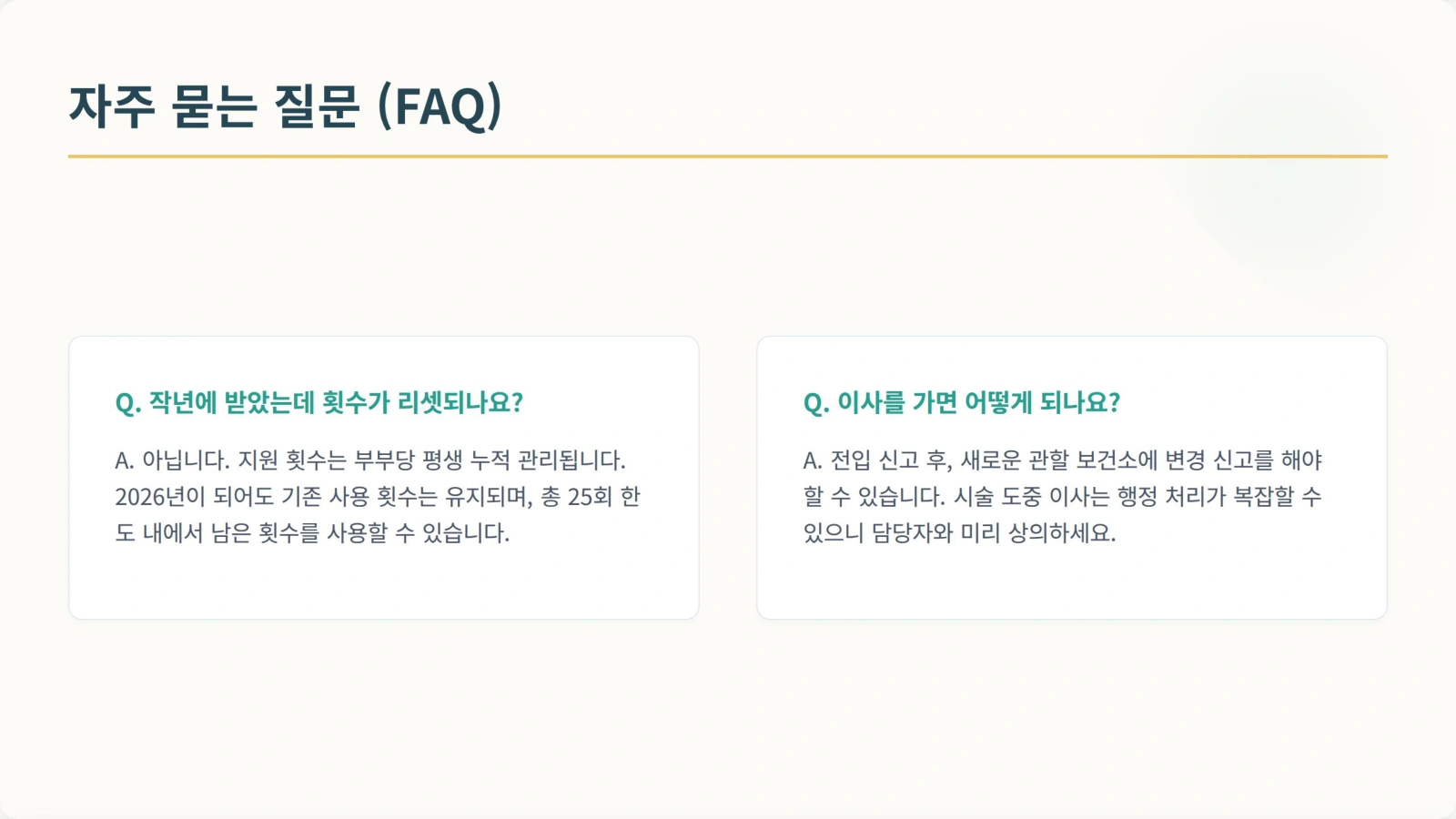 A. 아니요, 횟수는 누적됩니다. 부부당 평생 지원 횟수(총 25회)에서 차감되는 방식입니다. 해가 바뀐다고 리셋되지 않습니다.